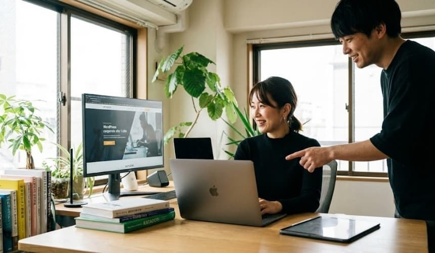 制作会社に数十万円を払う必要は、もうありません。WordPressテーマSWELLとKATADORIがあれば、企業サイト(コーポレートサイト)・店舗サイトを自分たちで構築・運用できます。構成やデザインに悩むことなく、必要な情報を自分たちのタイミングで更新できるため、“作って終わり”ではなく“育てていけるホームページ”が持てます。