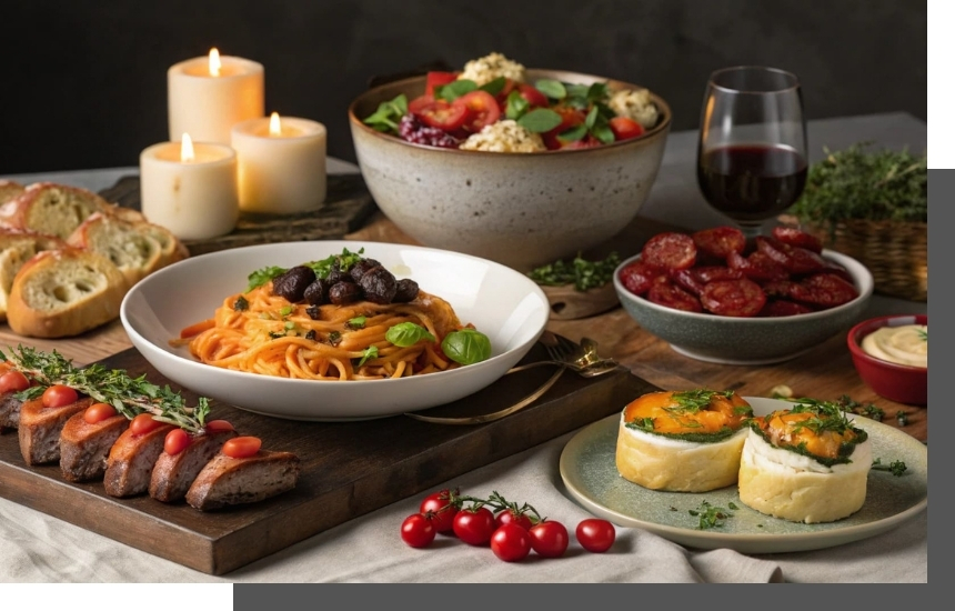 ワインとともに味わう前菜、メイン、パスタ、そしてシェフおすすめの逸品で、会話が弾むディナータイムを演出します。